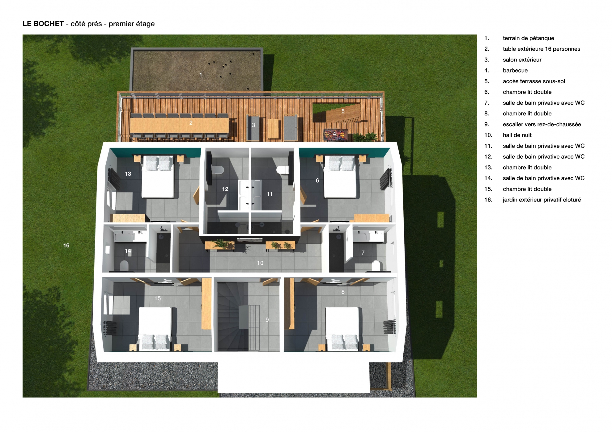 Ce gîte de grande capacité a ouvert ses portes en décembre 2021 et comme à l’habitude, bénéficie de tout confort : 8 chambres doubles et 8 salles de douche, toutes les chambres ont leur télévision, salle de jeux avec billard, espace wellness extérieur couvert avec spa et cabine infrarouge, salon avec insert bois, grand jardin clôturé avec terrain de pétanque, terrasse exposée sud-ouest avec vue sur les forêts. Buanderie. Cuisine entièrement équipée. Parking privé.
