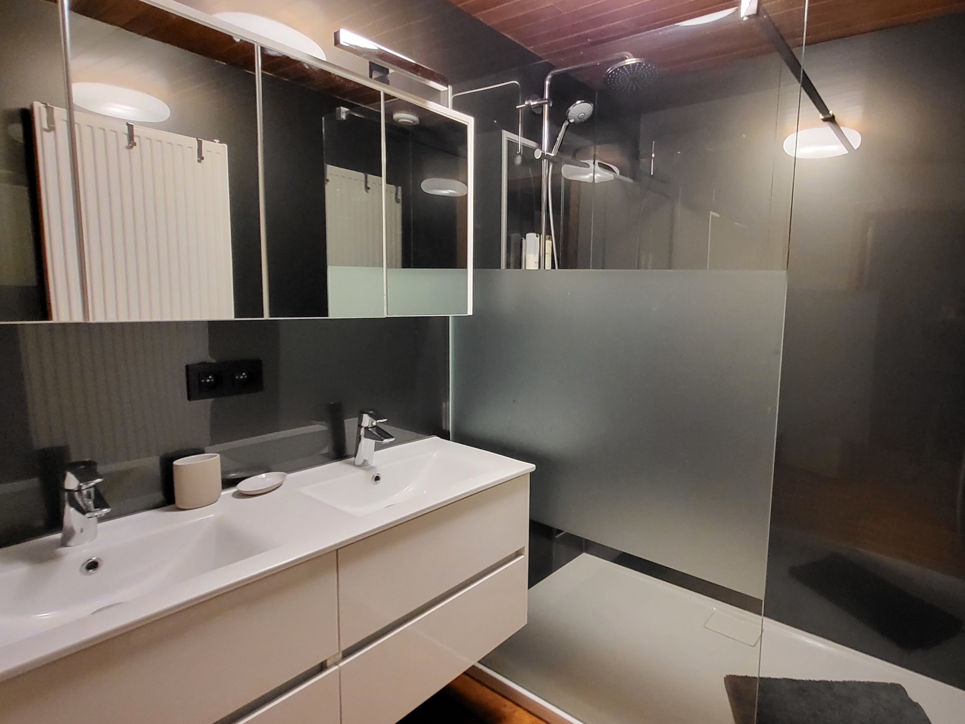 • 2 chambres dont une au rez-de-chaussée (1 salle de douche à l’italienne + 1 chambre avec lavabo et WC privé)